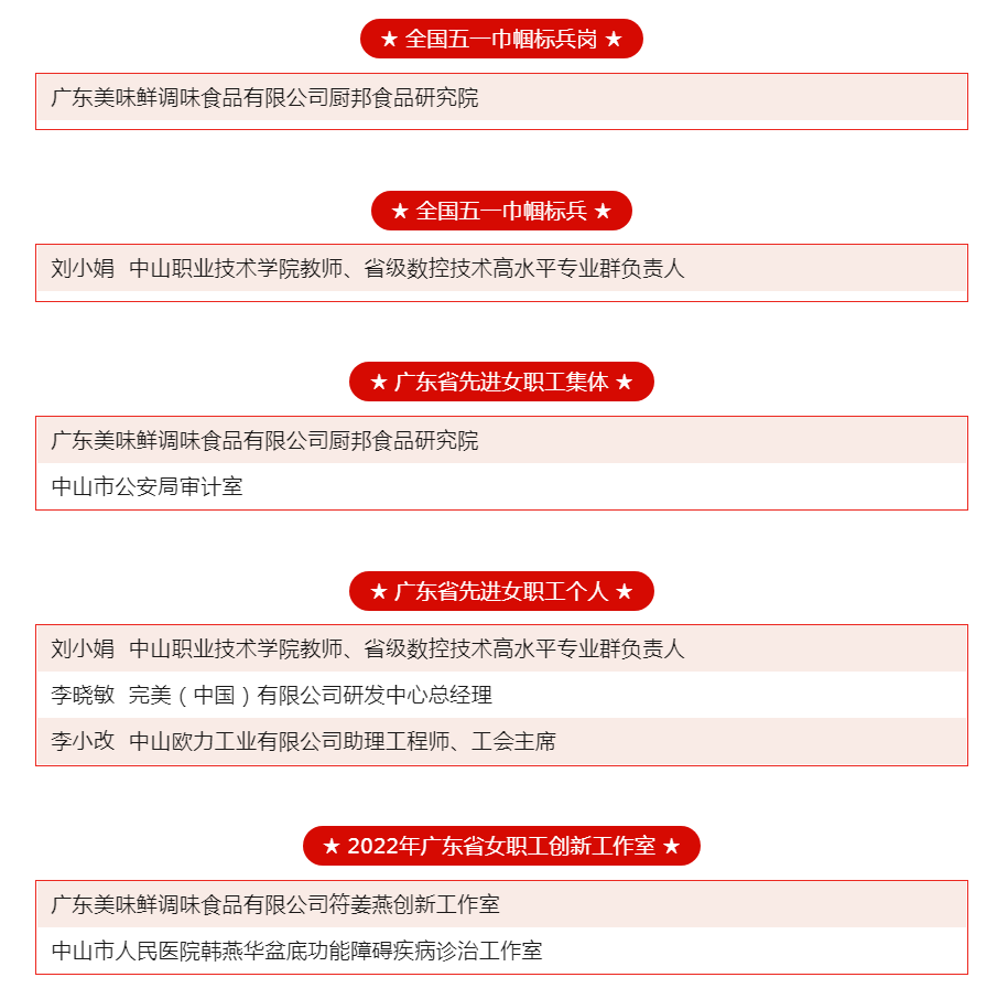 会议通过了有关人事事项,履行有关人事事项的民主程序,替补了中山市总工会第七届女职工委员会委员。对中山市荣获“全国五一巾帼标兵岗”“全国五一巾帼标兵”“广东省先进女职工集体”“广东省先进女职工个人”“2022年广东省女职工创新工作室”的集体和个人进行通报表扬和颁奖,鼓励他们珍惜荣誉、再接再厉,充分发挥先进示范引领作用,带动身边职工敬业奉献、争先创优。
